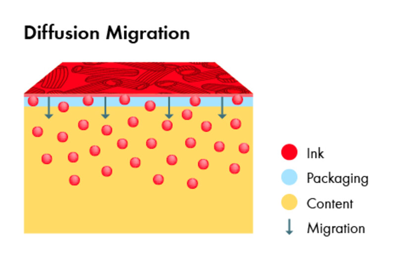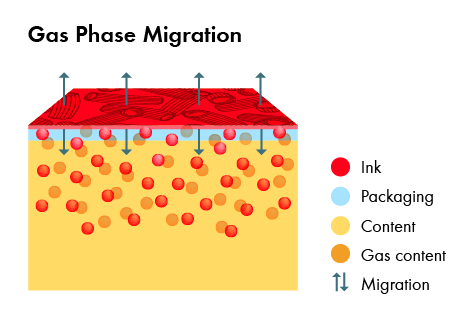 Inks printed on packaging come into indirect contact with food, and it is therefore possible for substances contained in the ink to migrate to the contents (e.g. via diffusion, set-off or gas phase migration, see chart 1-3). Migration is greatly influenced by the functional barrier of the substrate. The better this barrier, the lower any potential migration.